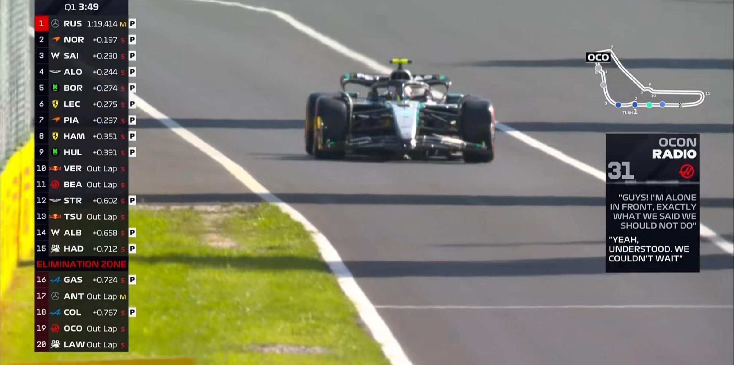 Q1首轮飞驰圈结束,两台迈凯伦领跑全场,两台威廉姆斯都出现失误未做出成绩;